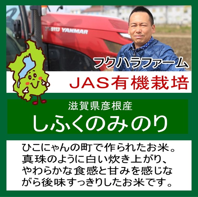 滋賀県彦根市は近江金地の北部に位置し、壮大な水田地帯が広がります。 高低差がなく、気候風土的に病害虫が発生しにくいうえに、琵琶湖の恵みによって水に困らないこの地域は大変米作りに適した地域です。 しふくのみのりはひとめぼれと同等の良食味です。粒ぞろいが良く、一粒一粒がふっくらとしており、甘みと旨みがあります。 冷めても美味しさが保たれるため、お弁当やおにぎりに適しています。